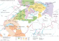 The succession dispute following the death of Rudolph III in 1032 allowed the Salian kings to acquire the Kingdom of Upper Burgundy and with it the Aare valley. As a part of the Holy Roman Empire, the valley was involved when the Investiture Controversy broke out in 1056. In 1077, the Regent of Burgundy, Count Rudolf of Rheinfelden, declared himself as an anti-king against King Henry IV. The Bishops of Basel and Lausanne remained loyal to King Henry IV, and took the Rheinfelden lands in Oberaargau and the upper Aare valley. After Rudolf's death in 1090, his lands went to his son, Berchtold II of Zähringen. He and his son, Berchtold III, tried to use these lands to expand their power. In 1127 the Zähringer were appointed Rector or delegate of the king in Burgundy. Their hopes for a new, independent Burgundy were dashed in 1156, and the last Zähringen count, Berchtold V, embarked on a program of city founding. The cities of Burgdorf, Murten, Thun and Bern were all founded by Berchtold V. When he died without an heir, the Zähringen lands went to the House of Kyburg, while the offices and fiefs reverted to the empire.[4]