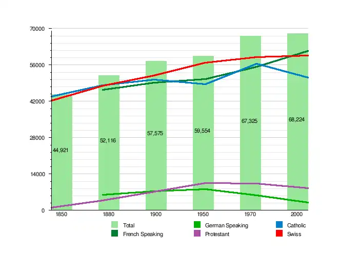 | Year | Total Population | French-speaking | German-speaking | Protestant | Catholic | Other | Jewish | Muslim | No religion given | Swiss | Non-Swiss |