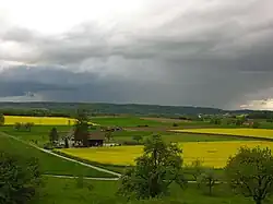 Schaffhausen is the northernmost canton of Switzerland and lies almost entirely on the right bank of the Rhine, with only part of Stein am Rhein on the left bank. It lies west of Lake Constance and has an area of 298 km2 (115 sq mi).[6] Much of the canton is productive agricultural land, with 134.4 km2 (51.9 sq mi) (about 45%) of the canton used for agriculture while an additional 128.7 km2 (49.7 sq mi) (about 43%) is wooded. Most of the rest of the canton, 31.8 km2 (12.3 sq mi) (about 10%), is developed, while only 3.8 km2 (1.5 sq mi) (1.3%) of the canton is unproductive (rivers, lakes or mountains).[7]