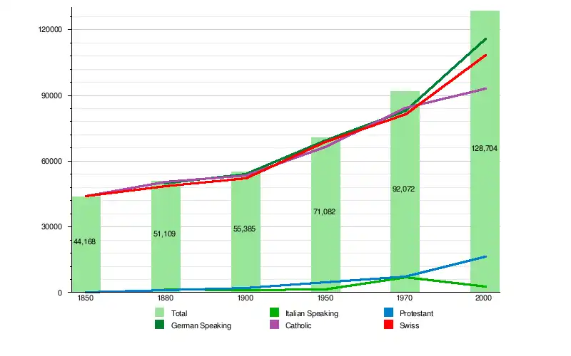 | Year | Total Population | German Speaking | Italian Speaking | Catholic | Protestant | Other | Jewish | Islamic | No religion given | Swiss | Non-Swiss |