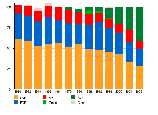 | CVP/PDC/PPD/PCD | Christian democracy | 38.5 | 46.4 | 49.4 | 46.6 | 36.9 | 32.8 | 27.4 | 27.3 | 23.4 | 20.1 | 20.6 | 19.5 | |