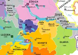 In 1440–1446, Schwyz and six other cantons fought against Zürich and the Habsburgs in the Old Zürich War. The eventual peace brought Zürich back into the Confederation and forced them to cancel their treaty with the Austrians. After the war, Schwyz acquired the villages of Wollerau and Pfäffikon (now in Freienbach) and shared control of Uznach and Gaster (both now in St. Gallen) with Glarus. The war also showed that the confederation had grown into a political alliance so close that it no longer tolerated separatist tendencies of a single member.[19]