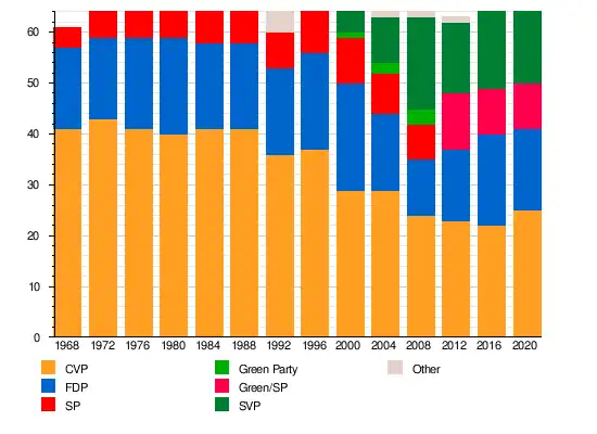 In the last election, on 8 March 2020, saw the centre maintain its dominance of the Landsrat. The Christian Democrats (CVP) gained three seats and remained the largest party with 25 seats. The Swiss People's Party lost two seats to remain the third strongest party, while the FDP.The Liberals who had lost two seats remained second with 16. The coalition of the Social Democratic and the Green retained its 9 seats and remained the smallest fraction in the Landrat.[26]