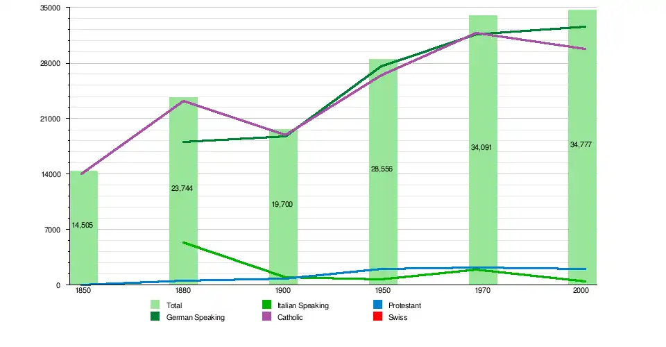 | Year | Total Population | German Speaking | Italian Speaking | Catholic | Protestant | Other | Jewish | Christian Catholic | No religion given | Swiss | Non-Swiss |