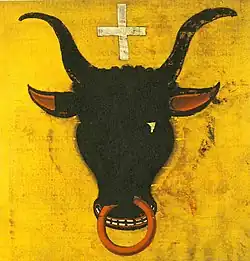 The use of the bull's head as heraldic charge may be due to a popular etymology associating the canton's name with the name of the aurochs.[6] It is certain that such an association was made in the early modern period; the introduction of the bull as heraldic animal dates to the 13th century. Uri used a seal with a bull's head, seen from the side, by 1243. By the 14th century, Uri was using a banner showing a black bull's head in a yellow field. In the town-hall of Altfdorf, six cantonal banners dating to the Old Swiss Confederacy are preserved, reportedly dating from the battles of Morgarten (1315) and Sempach (1386), the Old Zürich War (1443), the Burgundian Wars (1476) and the Swabian War (1499), and the Juliusbanner (1512).[15]