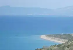 Cape Araxos (Greek: Ακρωτήριον Άραξος), also known as Cape Pappas (Άκρα Πάππα), is a cape in the northwest of the Peloponnese in Greece. It is the northwesternmost point of Peloponnese and separates the Gulf of Patras from the Ionian Sea. It lies at a distance of 30 km (19 mi) west of the city of Patras and very close to the village of Akrotirio Araxou. In 1877 a stone lighthouse was built, but it was destroyed during the Second World War and a modern lighthouse was installed after some years. The waters in the area are dangerous because of the continuous additions of sediments, eroding from the uplands of Aetolia-Acarnania via the rivers Acheloos and Evinos, The waters are quite shallow in some parts.