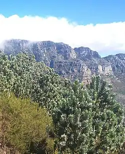 Remnant patches of indigenous forest persist in the wetter ravines. However, much of the indigenous forest was felled by the early European settlers for fuel for the lime kilns needed during the construction of the Castle.[26] The exact extent of the original forests is unknown, though most of it was probably along the eastern slopes of Devil's Peak, Table Mountain and the Back Table where names such as Rondebosch, Kirstenbosch, Klaassenbosch and Witteboomen survive (in Dutch "bosch" means forest; and "boomen" means trees). Hout Bay (in Dutch "hout" means wood) was another source of timber and fuel as the name suggests.[26] In the early 1900s commercial pine plantations were planted on these slopes all the way from the Constantiaberg to the front of Devil's Peak, and even on top of the mountains, but these have now been largely cleared allowing fynbos to flourish in the regions where the indigenous Afromontane forests have not survived, or never existed.