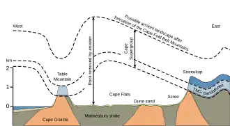 The sedimentary rocks of the Cape Supergroup, of which parts of the Graafwater and Peninsula Formations remain, were uplifted between 280 and 21S million years ago, and were largely eroded away during the Mesozoic. The region was geologically stable during the Tertiary, which has led to slow denudation of the durable sandstones. Erosion rate and drainage has been influenced by fault lines and fractures, leaving remnant steep-sided massifs like Table Mountain surrounded by flatter slopes of deposits of the eroded material overlaying the older rocks,[3]