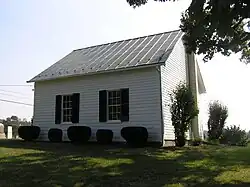 According to the church's caretaker, Brenda Hiett, the church's roof and siding were installed around 1900.[8] A wrought iron fence, made by Stewart Iron Works in Cincinnati, Ohio, was installed around the church's cemetery.[32] Electrical conduits were added to the interior of the church when it was electrified around 1930, and further electrical updates were made in 2011.[32] The church's perimeter foundation of concrete blocks replaced the original stone piers in the early 1970s, and its wide, heart pine plank floors were sanded and re-lacquered.[32] Around 1990, the Stewart Iron Works fence and gate were restored by White's Ornamental Ironworks.[32]