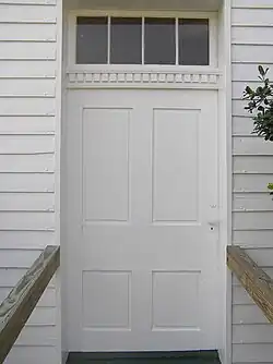 The church's main façade is located on its east side, facing toward Timber Ridge, and away from the Cacapon River and Christian Church Road. The east side consists of a front gable façade of white-painted clapboard siding. The church has one entryway, which is a centrally located, four-paneled wooden door, topped by wooden dentil molding and a rectangular, four-light transom window. The transom is the only window on the church's east side. Unpainted wooden railings are on each side of the entryway. The clapboard siding on the church's east side is horizontal, and varies between 5 and 7 inches (13 and 18 cm) in width. The overhanging eave of the church's roof is accentuated by a single wooden drop pendant at the top of the gable. The modern electricity meter is located to the right of the main entrance. The non-loadbearing concrete block perimeter wall on this side is concealed by a stone veneer.[8]