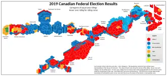 Also called irregular cartograms or deformation cartograms,[19] This is a family of very different algorithms that scale and deform the shape of each district while maintaining adjacent edges. This approach has its roots in the early 20th Century cartograms of Haack and Weichel and others, although these were rarely as mathematically precise as current computerized versions. The variety of approaches that have been proposed include cellular automata, quadtree partitions, cartographic generalization, medial axes, spring-like forces, and simulations of inflation and deflation.[18] Some attempt to preserve some semblance of the original shape (and may thus be termed homomorphic),[25] but these are often more complex and slower algorithms than those that severely distort shape.