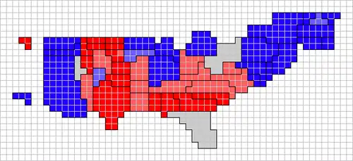 This method works best with variables that are already measured as a relatively low-valued integer, enabling a one-to-one match with the cells. This has made them very popular for visualizing the United States Electoral College that determines the election of the president, appearing on television coverage and numerous vote-tracking websites.[27] Several examples of block cartograms were published during the 2016 U.S. presidential election season by The Washington Post,[28] the FiveThirtyEight blog,[29] and the Wall Street Journal,[30] among others. This is a cartogram for the 2024 and 2028 elections, based on the 2020 Census apportionment: