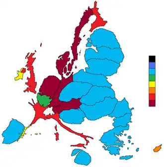 A number of software packages generate cartograms. Most of the available cartogram generation tools work in conjunction with other GIS software tools as add-ons or independently produce cartographic outputs from GIS data formatted to work with commonly used GIS products. Examples of cartogram software include ScapeToad,[33][34] Cart,[35] and the Cartogram Processing Tool (an ArcScript for ESRI's ArcGIS), which all use the Gastner-Newman algorithm.[36][37] An alternative algorithm, Carto3F,[38] is also implemented as an independent program for non-commercial use on Windows platforms.[39] This program also provides an optimization to the original Dougenik rubber-sheet algorithm.[40] [41] The CRAN package recmap provides an implementation of a rectangular cartogram algorithm.[42]
