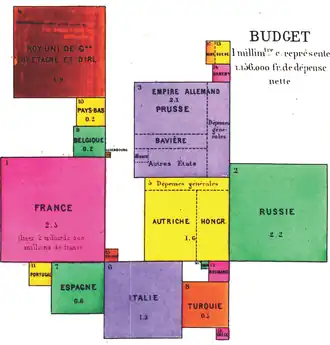 The cartogram was developed later than other types of thematic maps, but followed the same tradition of innovation in France.[3] The earliest known cartogram was published in 1876 by French statistician and geographer Pierre Émile Levasseur, who created a series of maps that represented the countries of Europe as squares, sized according to a variable and arranged in their general geographical position (with separate maps scaled by area, population, religious adherents, and national budget).[4] Later reviewers have called his figures a statistical diagram rather than a map, but Levasseur referred to it as a carte figurative, the common term then in use for any thematic map. He produced them as teaching aids, immediately recognizing the intuitive power of size as a visual variable: "It is impossible that the child is not struck by the importance of the trade of Western Europe in relation to that of Eastern Europe, that he does not notice how much England, which has a small territory but outweighs other nations by its wealth and especially by its navy, how much on the contrary Russia which, by its area and its population occupies the first rank, is still left behind by other nations in the commerce and navigation."
