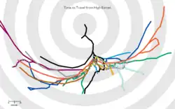 While an area cartogram manipulates the area of a polygon feature, a linear cartogram manipulates linear distance on a line feature. The spatial distortion allows the map reader to easily visualize intangible concepts such as travel time and connectivity on a network. Distance cartograms are also useful for comparing such concepts among different geographic features. A distance cartogram may also be called a central-point cartogram.