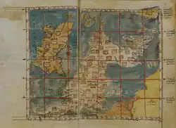 A 14th-century Byzantine map of the British Isles from a manuscript of Ptolemy's Geography, using Greek numerals for its graticule: 52–63°N of the equator and 6–33°E from Ptolemy's Prime Meridian at the Fortunate Isles.