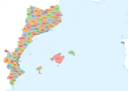 The Catalan Countries (Catalan: Països Catalans, Eastern Catalan: [pəˈizus kətəˈlans]) refers to the territories where the Catalan language is spoken.[1][2] They include the Spanish autonomous communities of Catalonia, the Balearic Islands, Valencian Community, and parts of Aragon (La Franja) and Murcia (Carche),[3] as well as the Principality of Andorra, the department of Pyrénées-Orientales (aka Northern Catalonia, including Cerdanya, Rosselló, and Vallespir) in France, and the city of Alghero in Sardinia (Italy).[1][4][5][6] It is often used as a sociolinguistic term to describe the cultural-linguistic area where Catalan is spoken. In the context of the Catalan independence movement, the term is sometimes used in a more restricted way to refer to just Catalonia, Northern Catalonia, Valencia and the Balearic Islands.[7][8][9] The Catalan Countries do not correspond to any present or past political or administrative unit, though most of the area belonged to the Crown of Aragon in the Middle Ages. Parts of Valencia (Spanish) and Catalonia (Occitan) are not Catalan-speaking.