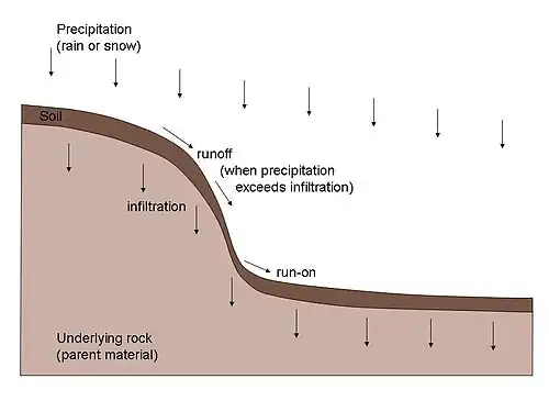 Lithology and relief can be the primary controls on the development of certain catenas[6] with easily disaggregated parent rock and high relief favoring particle redistribution and therefore the formation of distinct soils in particle-source and particle-deposition zones along a slope.[7] Catenas can also develop on low relief hillslopes, but because less potential energy is available, the redistribution of mass can be dominated by subsurface flow of plasma, a combination of dissolved and suspended solids in soil water.[8][9][7]