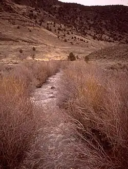 The Catlow Valley topography provides a number of wildlife habitats. These include seasonal lakes, marshes, riparian areas, grasslands, sage steppe, dry juniper forests, and rimrock. The valley is predominantly high-desert grassland with gently rolling hills to the north, west, and south of the valley floor. There are wetlands and meadows at the mouth of canyons where runoff from Hart Mountain and Steens Mountain drains into the valley. There are two major drainages from Hart Mountain on the west side of the valley, Rock Creek and Guano Creek. Rock Creek enters the valley from the northwest, and Guano Creek flows in from the southwest. The east side of the valley is bounded by Catlow Rim, a steep and rugged cliff. The rim is cut by canyons that channel runoff into small man-made reservoirs and shallow natural marshes along the edges of the valley floor. The three main drainages on the east side of the valley are Home Creek, Threemile Creek, and Skull Creek.[2][13][14] On the east side of the valley, Catlow Rim provides a rimrock habitat.[15] Some of the east slope of Hart Mountain and the west slope of Steens Mountain are lightly covered with western juniper. There are also aspen trees in areas where winter snow tends to accumulate, as well as a ponderosa pine grove in one area on Hart Mountain.[5]