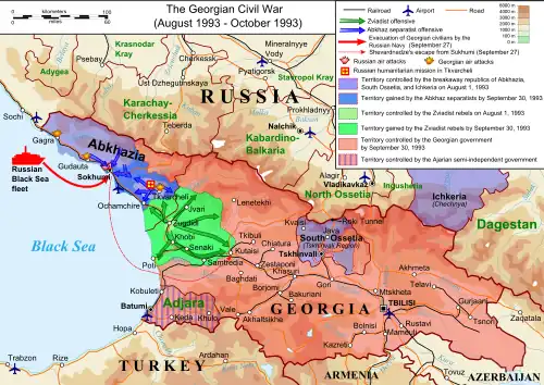 The region has been subject to various territorial disputes since the collapse of the Soviet Union, leading to the First Nagorno-Karabakh War (1988–1994), the East Prigorodny Conflict (1989–1991), the War in Abkhazia (1992–93), the First Chechen War (1994–1996), the Second Chechen War (1999–2009), Russo-Georgian War (2008), and the Second Nagorno-Karabakh War (2020).
