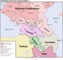 The term Caucasus is not only used for the mountains themselves but also includes Ciscaucasia (which is part of the Russian Federation) and Transcaucasia.[21] According to Alexander Mikaberidze, Transcaucasia is a "Russo-centric" term.[22]