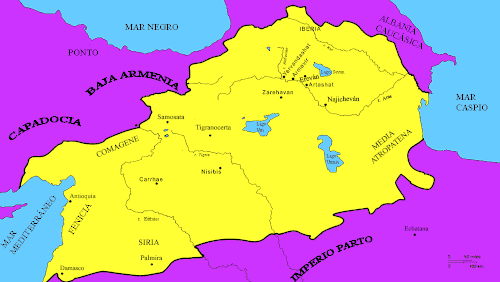 Under Ashurbanipal (669–627 BC), the boundaries of the Assyrian Empire reached as far as the Caucasus Mountains. Later ancient kingdoms of the region included Armenia, Albania, Colchis and Iberia, among others. These kingdoms were later incorporated into various Iranian empires, including Media, the Achaemenid Empire, Parthia, and the Sassanid Empire, who would altogether rule the Caucasus for many hundreds of years. In 95–55 BC, under the reign of the Armenian king Tigranes the Great, the Kingdom of Armenia included Kingdom of Armenia, vassals Iberia, Albania, Parthia, Atropatene, Mesopotamia, Cappadocia, Cilicia, Syria, Nabataean kingdom, and Judea. By the time of the first century BC, Zoroastrianism had become the dominant religion of the region; however, the region would go through two other religious transformations. Owing to the strong rivalry between Persia and Rome, and later Byzantium. The Romans first arrived in the region in the 1st century BC with the annexation of the kingdom of Colchis, which was later turned into the province of Lazicum.[35] The next 600 years was marked by a conflict between Rome and Sassanid Empire for the control of the region. In western Georgia the eastern Roman rule lasted until the Middle Ages.[36]