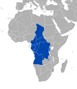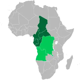Central Africa (French: Afrique centrale; Spanish: África central; Portuguese: África Central) is a subregion of the African continent comprising various countries according to different definitions. Middle Africa is an analogous term used by United Nations in geoscheme for Africa and consists of the following countries: Angola, Cameroon, Central African Republic, Chad, Democratic Republic of the Congo, Republic of the Congo, Equatorial Guinea, Gabon, and São Tomé and Príncipe. The United Nations Office for Central Africa also includes Burundi and Rwanda in the region, which are considered part of East Africa in the geoscheme.[1] These eleven countries are members of the Economic Community of Central African States (ECCAS).[1] Six of those countries (Cameroon, Central African Republic, Chad, Equatorial Guinea, Gabon, and Republic of the Congo) are also members of the Economic and Monetary Community of Central Africa (CEMAC) and share a common currency, the Central African CFA franc.[2]