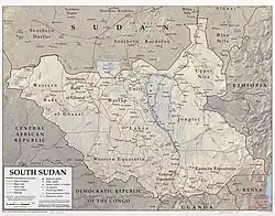 The precise starting point of the border in the north is in dispute, as both Sudan and South Sudan claim the Kafia Kingi region, which is currently under Sudanese administration.[2] Starting at the de facto tripoint, the border proceeds southwards for a short distance, before turning to the south-east.[3] The border then follows a series a very irregular lines overland in southeastwards direction, down to the tripoint with the DRC. The boundary roughly follows the division between the Nile and Congo drainage divide.[3]