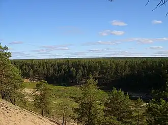 The Central Yakutian Lowlands extend along the middle basin of the Lena River and partly further downstream and are about 900 kilometres (560 mi) in length and 350 kilometres (220 mi) wide.[6] They drop gradually from the Central Siberian Plateau to the west and the Lena Plateau to the south and southwest. To the northwest the lowland merges with the North Siberian Lowland and to the north it is bound by the watershed fringing the Lena and Olenyok River basins. To the northeast and east the Central Yakutian Lowland reaches the foothills of the Verkhoyansk Range, westernmost part of the East Siberian Mountains.[7]