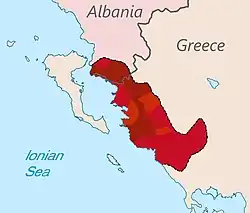 Chameria (Albanian: Çamëria; Greek: Τσαμουριά, Tsamouriá)[2] is a historical region along the coast of the Ionian Sea in southwestern Albania and northwestern Greece, traditionally associated with the Albanian ethnic subgroup of the Chams.[1][3] For a brief period (1909-1912), three kazas (Filat, Aydonat and Margiliç) were combined by the Ottomans into an administrative district called Çamlik sancak.[4] During the interwar period, the toponym was in common use[5] and the official name of the area above the Acheron river in all Greek state documents.[6] The term is used today mostly by Albanians[7] and it is obsolete in Greek,[8] surviving in some old folk songs. Most of what is called Chameria is divided between parts of the Greek regional units of Thesprotia, Preveza, and Ioannina (some villages at the western side); and the municipality of Konispol at the southernmost extremity of Albania. Apart from geographic and ethnographic usages, in contemporary times within Albania the toponym has also acquired irredentist connotations.[7]