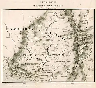 The early 19th c. Greek author Perraivos, notable for his works on Souli and Epirus, notes that the Albanian Chams inhabit the area between the Bistrica river in the north and the Souli area south.[14] French diplomat and General Consul of France in nearby Ioannina, François Pouqueville, noticed in 1814-1816 that there is a district named Chamouri that stretches from the Thyamis all the way down to the Acheron river.[15] In the early 1800s British colonel William Martin Leake while in the area described Chameria as stretching from the boundaries of Butrint and Delvinë until the Fanari and Paramythia areas consisting of two main sub-districts, Daghawi or Dai and Parakalamos.[16] During the 19th century, the novelista and poet Nikolaos Konemenos, an Arvanite from the area placed his home district of Lakka (Λάκκας)[17] within the bounds of Tsamouria (Τσαμουριά) or Chameria.[18] In the early 1880s, British diplomat Valentine Chirol who spent time in the area during the Eastern Crisis defined Chameria along linguistic lines in geographic terms where Albanian speakers were found during that time.[19] Chirol states that the Thiamis river basin, the Souli mountains, the Louros river valley up until the Preveza peninsula formed part of the district called "Tchamouria" which referred to the "southernmost Albanian settlements in Epirus".[19] Chirol also noted that due to the spread of the Chams in the area, the toponym also applied to the centre of the region where they held "undivided sway".[19]