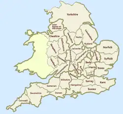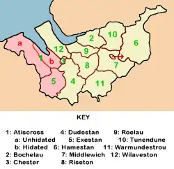 Cheshire in the Domesday Book (1086) is recorded as a much larger county than it is today. It included two hundreds, Atiscross and Exestan, that later became part of North Wales. At the time of the Domesday Book, it also included as part of Duddestan Hundred the area of land later known as English Maelor (which used to be a detached part of Flintshire) in Wales.[14] The area between the Mersey and Ribble (referred to in the Domesday Book as "Inter Ripam et Mersam") formed part of the returns for Cheshire.[15][16] Although this has been interpreted to mean that at that time south Lancashire was part of Cheshire,[16][17] more exhaustive research indicates that the boundary between Cheshire and what was to become Lancashire remained the River Mersey.[18][19][20] With minor variations in spelling across sources, the complete list of hundreds of Cheshire at this time are: Atiscross, Bochelau, Chester, Dudestan, Exestan, Hamestan, Middlewich, Riseton, Roelau, Tunendune, Warmundestrou and Wilaveston.[21]