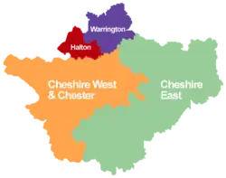 Devolution talks for the county were scheduled for Autumn 2024.[30] Plans to establish a Cheshire and Warrington Combined Authority were approved by the UK government in February 2025.[31] Halton Borough has been a member of the Liverpool City Region Combined Authority since that authority was established in 2014.