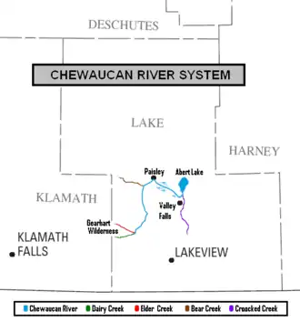 The Chewaucan flows for 53 miles (85 km) through Lake County, Oregon.[4] The sources of the Chewaucan are Elder Creek and Dairy Creek. Both have their headwaters in the east drainage of Gearhart Mountain Wilderness. The Chewaucan is the result of their merger east of the Gearhart Mountain Wilderness near Dairy Point. From there, the Chewaucan flows north through the Fremont-Winema National Forests, where waters from Ben Young Creek, Coffeepot Creek, Antelope Springs, Corral Creek, Dog Creek, Sage Hen Creek, Bear Creek, and Mill Creek flow into it before the river passes out of the forest near Paisley.[6]