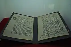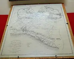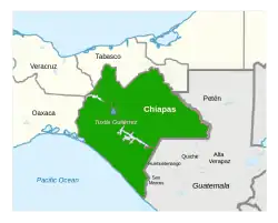 Elites in highland cities pushed for incorporation into Mexico.[15][20] In 1822, then-Emperor Agustín de Iturbide decreed that Chiapas was part of Mexico. In 1823, the Junta General de Gobierno was held and Chiapas declared independence again.[15] In July 1824, the Soconusco District of southwestern Chiapas split off from Chiapas, announcing that it would join the Central American Federation.[20] In September of the same year, a referendum was held on whether the intendencia would join Central America or Mexico, with many of the elite endorsing union with Mexico. This referendum ended in favor of incorporation with Mexico (allegedly through manipulation of the elite in the highlands), but the Soconusco region maintained a neutral status until 1842, when Oaxacans under General Antonio López de Santa Anna occupied the area, and declared it reincorporated into Mexico. Elites of the area would not accept this until 1844.[15][25][26] Guatemala would not recognize Mexico's annexation of the Soconusco region until 1895, even though the border between Chiapas and Guatemala had been agreed upon in 1882.[20][26] The State of Chiapas was officially declared in 1824, with its first constitution in 1826. Ciudad Real was renamed San Cristóbal de las Casas in 1828.[16]
