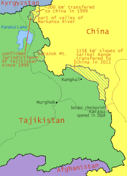 8. ^ a b Alex Sodiqov (24 January 2011). "Tajikistan cedes disputed land to China". Eurasia Daily Monitor. 8 (16). Jamestown Foundation. Retrieved 23 September 2018. On January 12, the lower house of the Tajik parliament voted to ratify the 2002 border demarcation agreement, handing over 1,122 square kilometers (433 square miles) of mountainous land in the remote Pamir Mountains (www.asiaplus.tj, January 12). The ceded land represents about 0.8 percent of the country's total area of 143,100 square kilometers (55,300 square miles).{...}At the time of independence, Tajikistan inherited three disputed border segments, constituting about 28,500 square kilometers (11,000 square miles), which China and the Soviet Union had been unable to resolve. In 1999, Tajikistan and China signed a border demarcation agreement, defining the border in two of the three segments. Under the 1999 deal, Dushanbe ceded about 200 square kilometers (77 square miles) of land to Beijing (http://www.ca-oasis.info/oasis/?jrn=109&id=817).