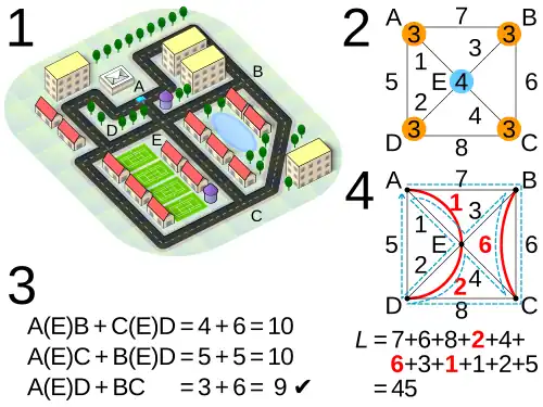 In graph theory and combinatorial optimization, Guan's route problem, the Chinese postman problem, postman tour or route inspection problem is to find a shortest closed path or circuit that visits every edge of an (connected) undirected graph at least once. When the graph has an Eulerian circuit (a closed walk that covers every edge once), that circuit is an optimal solution. Otherwise, the optimization problem is to find the smallest number of graph edges to duplicate (or the subset of edges with the minimum possible total weight) so that the resulting multigraph does have an Eulerian circuit.[1] It can be solved in polynomial time,[2] unlike the Travelling Salesman Problem which is NP-hard.[3] It is different from the Travelling Salesman Problem in that the travelling salesman cannot repeat visited nodes and does not have to visit every edge.