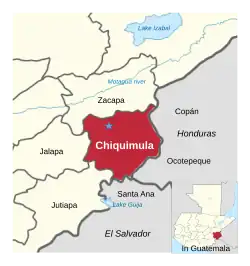 Chiquimula is one of the 22 departments of Guatemala, in Central America.[1] The departmental capital is also called Chiquimula.[2] The department was established by decree in 1871, and forms a part of the southeastern region of Guatemala. Physically, it is mountainous, with a climate that varies between tropical and temperate, depending on the location.