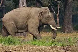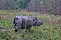 Indian rhinoceros: since 1973 the population has recovered well and increased to 544 animals around the turn of the century. To ensure the survival of the endangered species in case of epidemics animals are translocated annually from Chitwan to the Bardia National Park and the Shuklaphanta National Park since 1986. However, the population has repeatedly been jeopardized by poaching: in 2002 alone, poachers killed 37 individuals in order to saw off and sell their valuable horns.[4] Chitwan has the largest population of Indian rhinoceros in Nepal, estimated at 605 of 645 individuals in total in the country as of 2015.[18] Gaurs spend most of the year in the less accessible Churia Hills in the south of the national park. But when the bush fires ease off in springtime and lush grasses start growing up again, they descend into the grassland and riverine forests to graze and browse. The Chitwan population of the world's largest wild cattle species has increased from 188 to 368 animals in the years 1997 to 2016. Furthermore, 112 animals were counted in the adjacent Parsa Wildlife Reserve. The animals move freely between these parks. Apart from numerous wild boars, there are also herds of chital, sambar, red muntjac and Indian hog deer that inhabits the park. Choushingas and Himalayan serows reside predominantly in the hills. Rhesus macaques, gray langurs, Indian pangolins, Indian crested porcupines, several species of flying squirrels, black-naped hares and endangered hispid hares are also present.[16] Chitwan National Park received 18 wild water buffalo from Koshi Tappu Wildlife Reserve in 2016.[19]