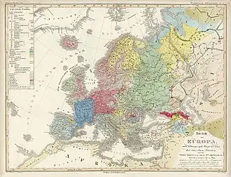 Perhaps the first master of this technique was Heinrich Berghaus. His 1837 Physikalischer Atlas, probably the first thematic atlas ever published, includes several color chorochromatic maps. These included a variety of topics from both physical and human geography: watersheds, geology, agriculture, biogeography, and ethnicity.[3] Much of the data was apparently obtained from Alexander von Humboldt.