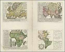 The chorochromatic map is one of the oldest types of thematic map, first appearing independently in several different fields.[2]: 52 In 1741, Gottfried Hensel published Synopsis Universae Philologiae, a book about world languages that included a set of maps of language regions, each with boundaries and colors for broad language families as he understood them. Other maps of cultural regions began to appear in the 19th Century.