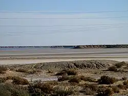 In geology, a chott, shott, or shatt (/ˈʃɒt/; Arabic: شط, romanized: šaṭṭ, lit. 'bank, coast') is a salt lake in Africa's Maghreb that stays dry for much of the year but receives some water in the winter. The elevation of a chott surface is controlled by the position of the water table and capillary fringe, with sediment deflation occurring when the water table falls and sediment accumulation occurring when the water table rises.[1] They are formed—within variable shores—by the spring thaw from the Atlas mountain range, along with occasional rainwater or groundwater sources in the Sahara, such as the Bas Saharan Basin.[2][3]