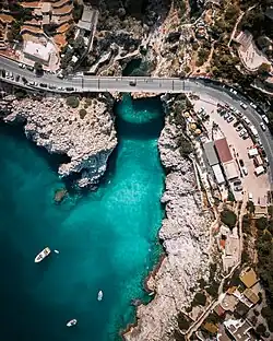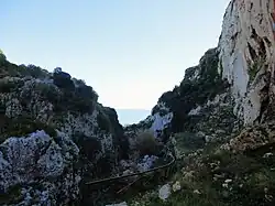Ciolo can be reached on foot along a 4 kilometer path, starting from the center of Gagliano del Capo.[37] From Ciolo to Gagliano del Capo it is possible to access the trail by a long staircase next to Ciolo's Bridge that provides access to the small cove; from there, leaving the sea behind, it is possible to climb the steep path that leads up to Gagliano del Capo. The route crosses the rock cliffs which contain numerous prehistoric caves; the whole path is completely surrounded by the characteristic Mediterranean landscape and also by certain rare species of plants such as the Alyssum of Leuca, the Vicia Giacominiana, the Anagyris foetida and different rare species of Orchidaceae.[37] Bird watchers can observe frequent sightings of migrating waders, jackdaws and rock pigeons; whereas sightings of the Eleonora's falcon are rarer. It is also possible to see different small chapels and votive aediculas in honour of Madonna di Leuca, symbolic of the area.[37][38]