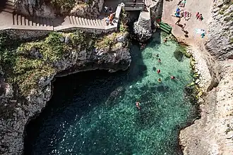 It is possible to access the sea for swimming and scuba diving. [39] Scuba divers, in Ciolo, have also the opportunity to explore the Grotta Grande del Ciolo. Although some points of the cave are quite narrow, it is possible for divers to explore the cave for its entire length safely with a little preparation.