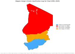 During the rainy season, winds from the southwest push the moister maritime system north over the African continent where it meets and slips under the continental mass along a front called the "intertropical convergence zone".[6] At the height of the rainy season, the front may reach as far as Kanem Prefecture.[6] By the middle of the dry season, the intertropical convergence zone moves south of Chad, taking the rain with it.[6] This weather system contributes to the formation of three major regions of climate and vegetation.[6]