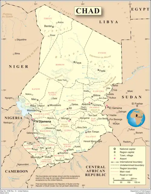 Chad exhibits two striking geographical characteristics.[6] First, the country is landlocked.[6] N'Djamena, the capital, is located more than 1,100 kilometers northeast of the Atlantic Ocean; Abéché, a major city in the east, lies 2,650 kilometers from the Red Sea; and Faya-Largeau, a much smaller but strategically important center in the north, is in the middle of the Sahara Desert, 1,550 kilometers from the Mediterranean Sea.[6] These vast distances from the sea have had a profound impact on Chad's historical and contemporary development.[6]