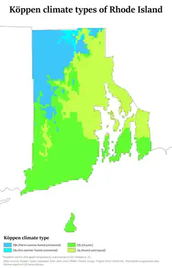 The United States Environmental Protection Agency reports that Rhode Island's climate has warmed about three degrees Fahrenheit since 1900.[1]
