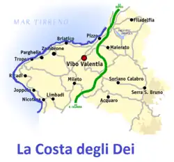 The Coast of the Gods (Italian: Costa degli Dei or Costa Bella) a scenic section of the Mediterranean Sea coastline in Italy.