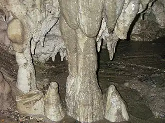 The story of Cody Caves began 600 million years ago when the limestone in which the caves later formed was laid down at the bottom of an ancient sea. Then, around 170 million years ago, the limestone beds were thrust upwards. This exposed the rock to the elements, water and carbonic acid, which eventually formed Cody Caves.[5] Approximately 875 yards (800 m) of the Cody Caves passageways are explorable. The caves have several types of calcite formations, such as stalagmites, stalactites, soda straws and flowstone These ancient formations have been growing at an average rate of one cubic centimetre per hundred years.[1] The boxwork is considered to be among the best in the world, protruding up to 20.3 cm, whereas 2.5 to 5 cm is average.[3][5]