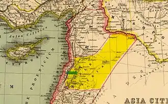 Authors of the Roman period differ on the limits of Coele-Syria, some extending and others contracting them. The Geography of Strabo notes that Coele Syria Propria (Proper) is defined by the Libanus and Anti-libanus mountain ranges, running parallel to each other.[28] In the wars between the Ptolemies and the Seleucidæ, the name Cœle Syria was applied to the whole of the southern portion of Syria, but under the Romans, it was confined to "Cœlesyria Proper" and variously included the district east of Anti-Libanus, about Damascus, and a portion of Palestine east of the Jordan river (possibly of: Trans-Jordan, Perea, or the Decapolis).[29]